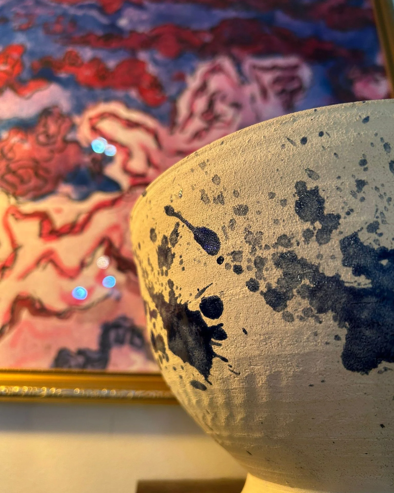 Beyond ceramics, Zanna is a dedicated fine artist. She particularly enjoys experimenting with various mediums to create layered, stylised paintings. Her approach consistently focuses on rich surface decoration and expressive texture, connecting the intricate finishes of her pottery to her vibrant work on canvas.